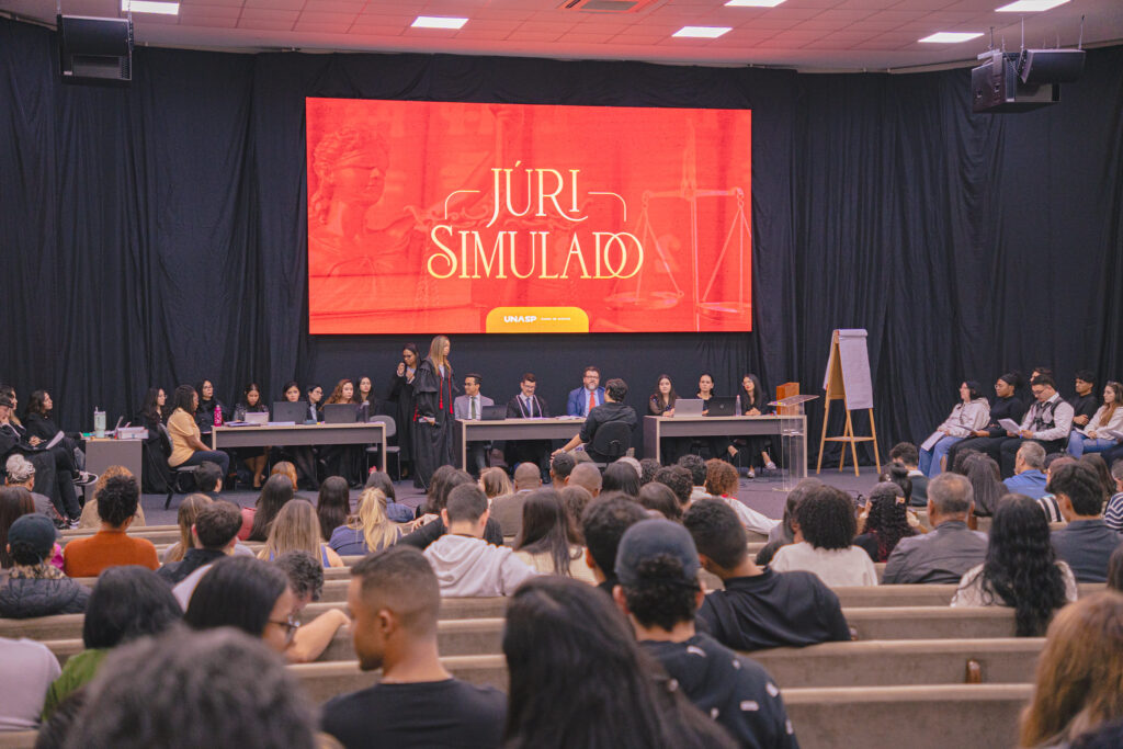 O UNASP campus Hortolândia realizou um júri simulado que reuniu os estudantes do curso de Direito ontem (03), no Auditório Arlete Afonso. O evento contou com a colaboração de professores do curso e envolveu alunos de diferentes semestres. Ao longo do evento, os participantes foram organizados em quatro núcleos: defesa, acusação, judiciário e equipe de produção.