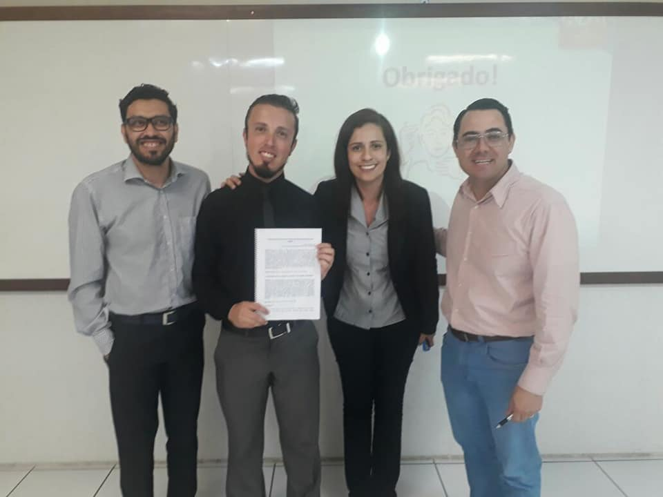 Aluno Edson Loxe por ocasião da defesa do seu TCC, junto com os professores Fabio Bergamo e Walter Rubini, bem como a convidada da banca, a profissional surda Michele Estrela.